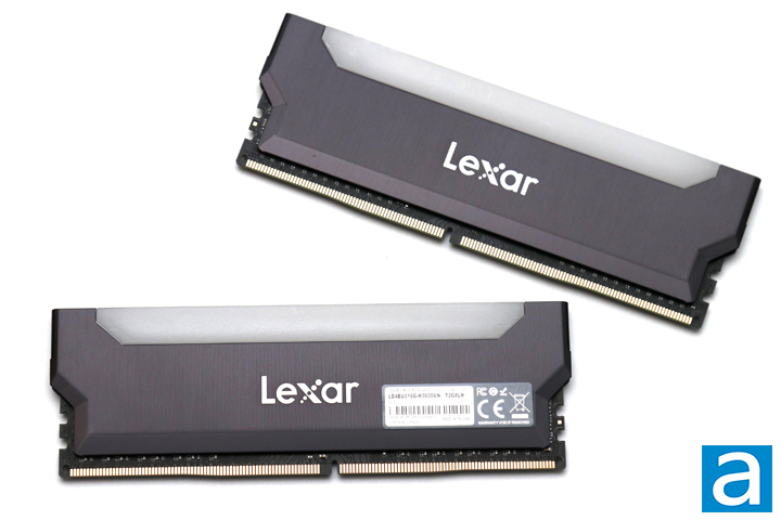 Even from the box picture alone, I really appreciate the clean look of the Lexar Hades RGB DDR4-3600 2x16GB kit. It is a bit strange they decided to name this memory kit after the name of the Greek underworld king, especially when you contrast this with how minimal and well-finished this kit is. The two sides are covered with a brushed black aluminum heatplate and a plastic translucent diffuser sits on top. With a medium height profile, the memory kit attracts a bit more attention with its lights turned on, but even the lighting is simple with just a straight bar down the top edge. The aluminum does cut away more in the middle of the memory sticks for more illumination from the side perspective. Otherwise, the aluminum sides are low weight but decent heat conductor. The heatsink and diffuser add approximately 1.5cm on top of your typical bare module. The taller height may affect your clearance issues under a CPU heatsink, but it is still relatively short.