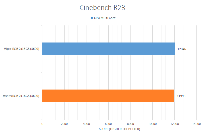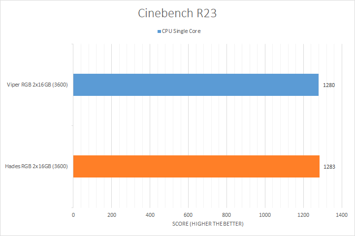 Cinebench R23 is Maxon's latest benchmark to measure CPU rendering performance. With this version, Cinebench split up their single and multi-core tests. Obviously, having a fast processor that performs well in IPC and with multiple threads will play a significant role in determining these scores, but memory still affects these results. As you can see in our charts above, the overall variance between the two tested RAM was inconsequential, with less than 0.5% of difference.
