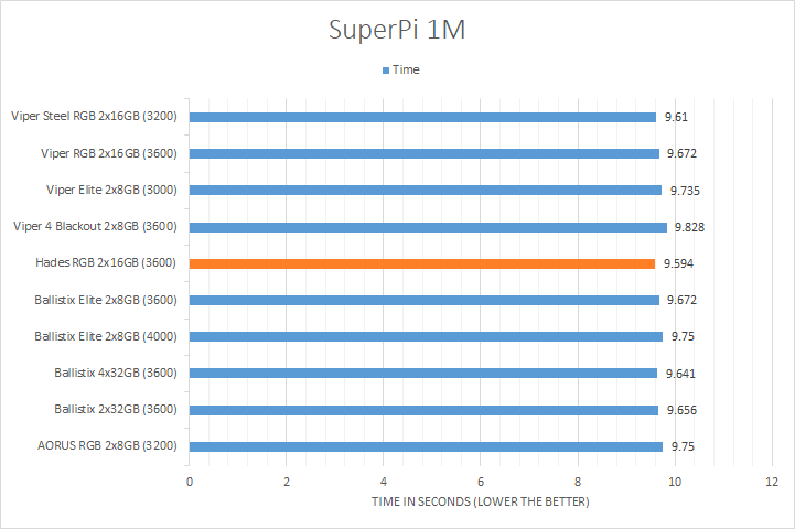 We have always included SuperPi in our benchmark results, because it is a quick and dirty run that always proves to be interesting. It is neither the fastest way to calculate Pi nor is it the most challenging. But being an enthusiast at heart, this program has always provided interesting results for showing off your overclocking prowess on your favorite online platform. This time around, all of the tested memory provided results of very similar times, with the Lexar Hades RGB DDR4-3600 2x16GB being the fastest. This is a pretty uninteresting endpoint, however, and may possibly just show the heavier reliance on the CPU rather than the memory in this benchmark.
