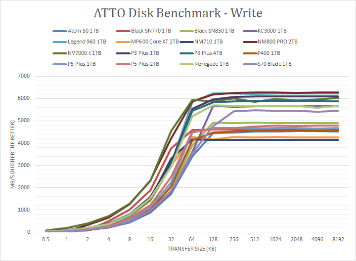 Following up next are our usual ATTO read and write tests. ATTO is an often-quoted benchmark because it is easy to use and accurate. ATTO uses easily compressible data, so compression-heavy controllers will perform very well here. As manufacturer peak read and write performance ratings are usually achievable using ATTO, whether a drive lives up to its marketing claims or not can be validated by this program. Lexar claims the NM710 1TB to have a maximum read speed of 5000 MB/s and a maximum write speed of 4500 MB/s. The NM710 1TB did not quite reach these figures when it came to the write speed, but came somewhat close with a tested maximum write speed of 4150 MB/s. The NM710 1TB also came close its rated read speed of 5000 MB/s by measuring a maximum read speed of 4740 MB/s. Taking a closer look below the curve, it was comparable to the the Corsair MP600 Core XT 2TB and Corsair P3 Plus 1TB with read and write speeds up to around 32KB to 64KB. The ramp-up write and read speeds was quite fast at small to moderate file sizes, specifically from 0.5KB to 64KB, but slower than the Netac NV7000-t 1TB, which delivered exceptional results in this range.