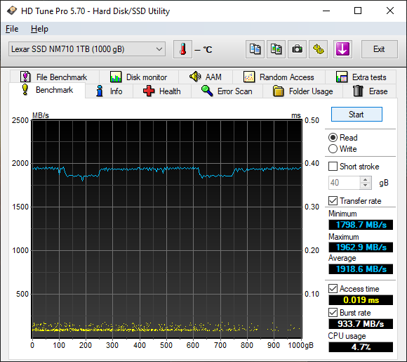 Unfortunately, HD Tune does not generate any fancy independent graph outputs, so I just took a screenshot of the program. Looking at the graph, we can see the Lexar NM710 1TB was pretty much flat the whole way. The access time was decent at 0.019ms. The average sequential read of 1918.6MB/s was underwhelming, falling behind the Netac NV7000-t 1TB at 2048.4MB/s, XPG Atom 50 1TB at 2654.3MB/s, Crucial P3 Plus at 2888.0MB/s, and Crucial P5 Plus 1TB at 2018.0MB/s, all of these being budget drives. The NM710 1TB was faster than the WD_BLACK SN770 NVMe SSD 1TB though, which scored 1317.5MB/s. With all that said, HD Tune is not the most representative test for solid state drives.