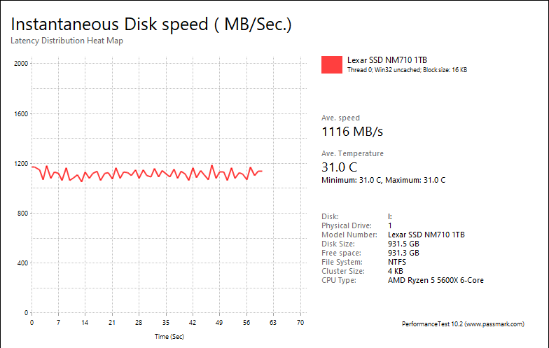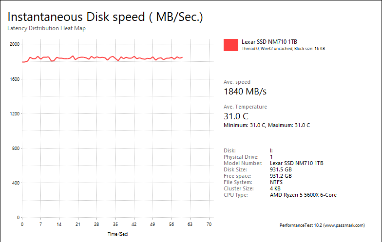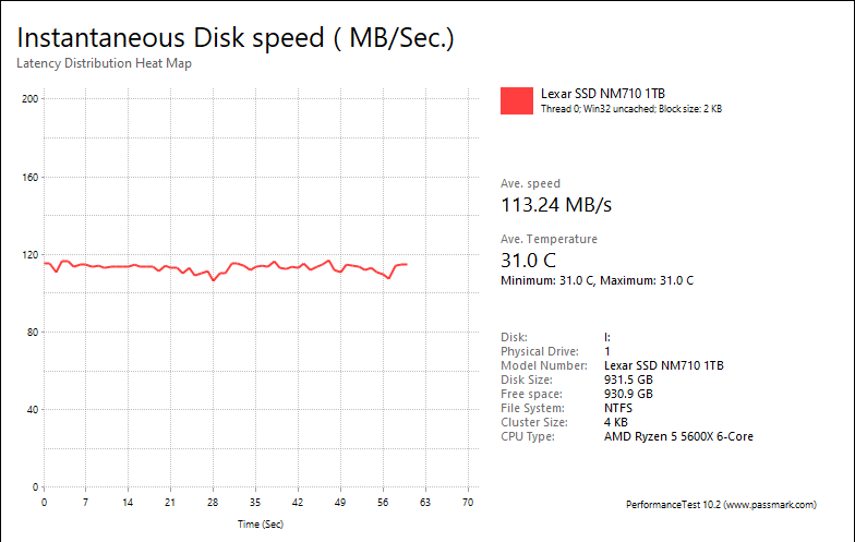 The Lexar NM710 1TB continued showing underwhelming performance here. The results were 113.24MB/s, 1116MB/s, 1840MB/s, and 211.74MB/s respectively. The Netac NV7000-t 1TB with the same controller posted 131.61MB/s, 1008MB/s, 3218MB/s, and 241.28MB/s, respectively. Unfortunately, these numbers fell significantly behind the WD_BLACK SN770 1TB in every category, with the SN770 1TB -- another budget DRAM-less SSD -- posting results at 366.45MB/s, 2716MB/s, 2915MB/s, 300.29MB/s, in the same order. The NM710 1TB scored closer to the Crucial P3 Plus 1TB, which scored at 267.34MB/s, 1986MB/s, 2044MB/s, and 253.39MB/s, respectively, although there is still a measurable performance gap. The DRAM-less Corsair MP600 Core XT 2TB came in at 255.02MB/s, 1808MB/s, 1840MB/s, and 255.77MB/s. Another DRAM-less drive, the XPG Atom 50 1TB, posted results of 32.46MB/s, 519.21MB/s, 2095MB/s, and 210.09MB/s, which the Lexar NM710 1TB beat out in each category with the exception of the web server test. That one was not hard to beat though. The NM710 1TB also beat out the Patriot P400 1TB, another budget drive that scored at 34.04MB/s, 543.30MB/s, 1493MB/s, and 198.25MB/s, respectively.