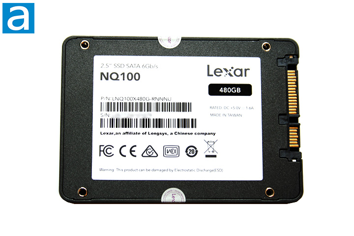 Flipping over the Lexar NQ100 480GB reveals the backside of the shell. There are no exposed circuit boards, as expected with most SSDs. The drive itself sits between two plastic shells that form the enclosure. The Lexar NQ100 480GB SATA 6Gb/s and power connectors are also visible towards the right side. The white sticker contains many certification logos along with the brand, capacity, serial number, and part number. The storage capacity of this version is 480GB, but the NQ100 also comes in 240GB and 960GB configurations at press time. This drive is manufactured in Taiwan.