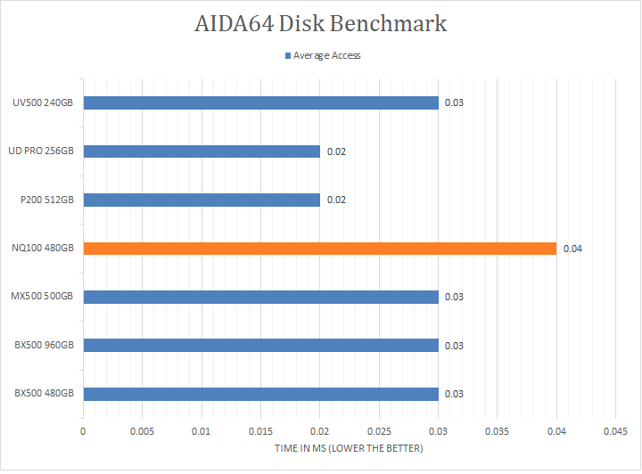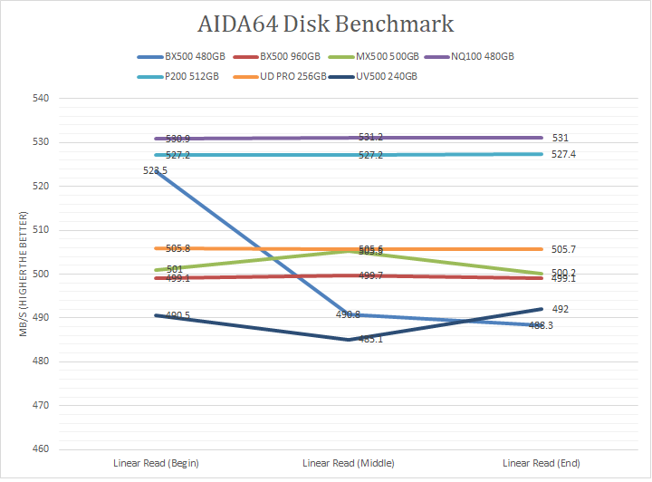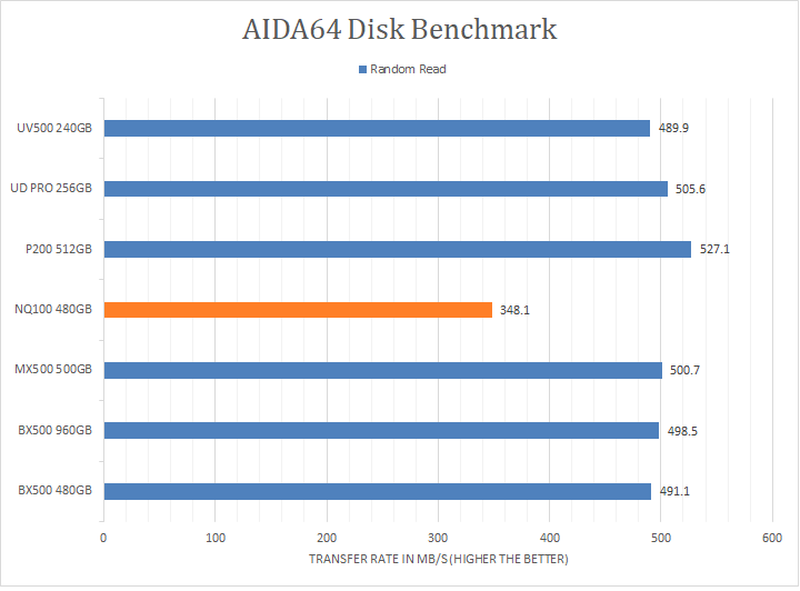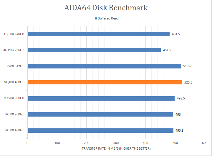 Going in alphabetical order, first up on the list are results from one of our favorite benchmarking programs, AIDA64 Engineer. Just to note, AIDA64 Engineer is a full synthetic benchmark. While it is not a representation of real-life performance -- such as how fast Photoshop opens -- it does provide valuable insight into performance between different drives and different controllers. From our graphs above, the Lexar NQ100 480GB produced mixed results when compared to other SATA SSDs, although not in the way you might think. The NQ100 480GB had the slowest results in the random read benchmark, falling far behind the competition. The tested latency was higher than all the other tested drives at an average of 0.04ms. However, it also scored at the top for buffered and linear read, although these scores were much closer to the other drives. The linear read consistently scored around 530 MB/s, which is not far off from the rated maximum read speed of 550 MB/s.