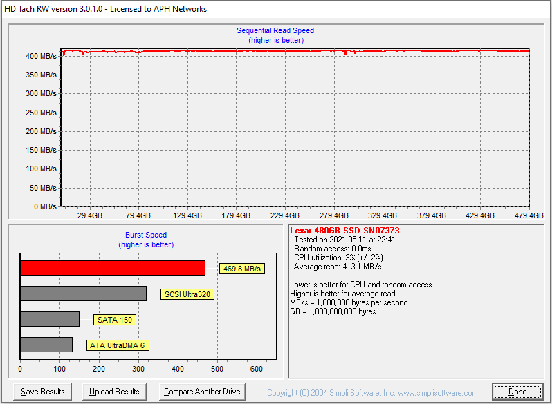 After giving the Lexar NQ100 480GB a clean format and ensuring alignment and everything is correct, I fired it up for some testing in HD Tach. While HD Tach is more of a drag race than a clear indication of real-life performance, it is an excellent storage performance reference among SSDs with the same controller and has been our favorite benchmark long before hard drives even cracked the 50MB/s mark. The average read speed came out to 413.1MB/s, which is comparable to other drives at a similar price range. For a more direct comparison, this speed was faster than the Crucial BX500 480GB, which came in at 383.1MB/s. The NQ100 480GB fell behind the Patriot P200 512GB though, which posted 486.3MB/s. The burst speed was measured at 469.8MB/s, which is about average for a solid state drive. At the end of the day, HD Tach may not be the best test for solid state drives all the time, but these results are always interesting to look at.