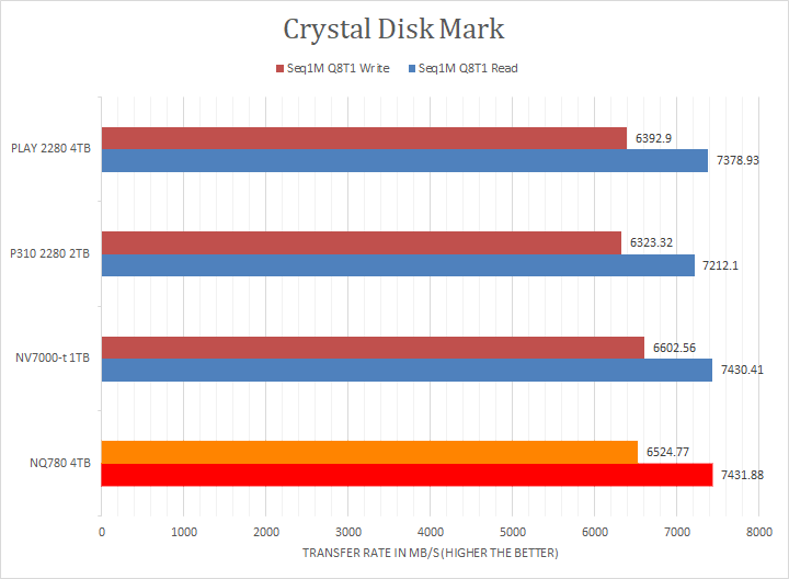 Moving on, Crystal Disk Mark 8.0 is our next benchmark. For a bit of background information, higher capacity drives tend to perform a little better in these tests. The ability of a controller and flash memory to deliver high IOPS will provide huge benefits to the score as well.