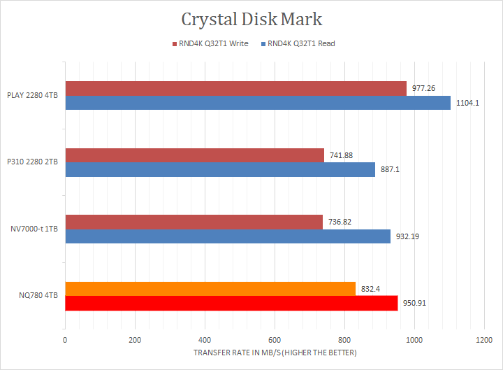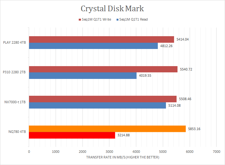 Lexar has made maximum claims of 6000MB/s write and 7000MB/s read for the NQ780 4TB. We normally see these peaks through Crystal Disk Mark, and from our results, you can see our unit surpasses these numbers. In the sequential 8-queue results, the Lexar NQ780 4TB peaked at 6524.77MB/s write and 7431.88MB/s read. This was the fastest in reading and second fastest in writing across the four drives compared. The sequential single queue results were more mixed, with the slowest read speed but fastest write result. In the random 4K, 32-queue test, its read and write performance was the second fastest. Finally, in the random 4K single queue test, the NQ780 4TB provided the slowest read and second slowest write. Overall, it does show some capable sequential capabilities, but less impressive random performance. You can make other comparisons from the graphs above.