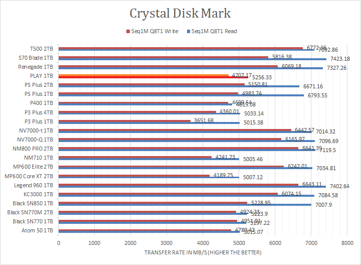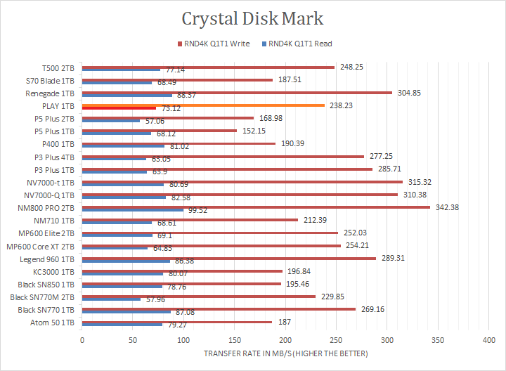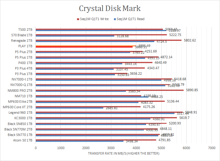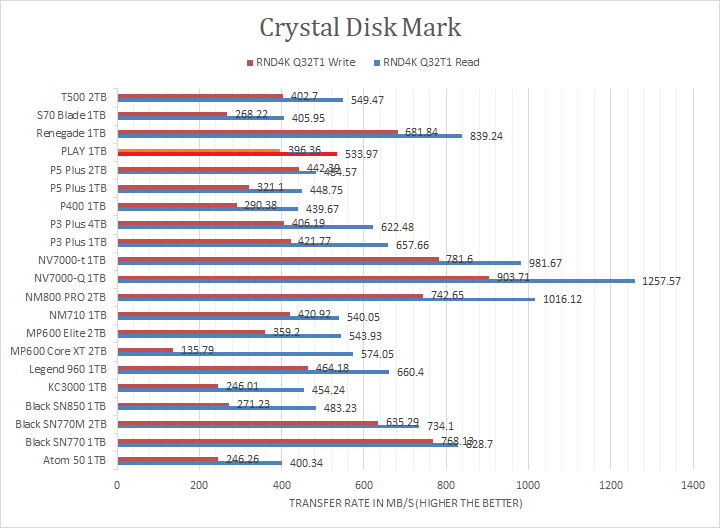 Lexar claims the PLAY 1TB's maximum read and maximum write are pinned at 5200MB/s and 4700MB/s, respectively. Looking at the read and write results, the PLAY 1TB was about mid-tier in the sequential read and write sections against other PCIe 4.0 NVMe drives, but this was to be expected per the specifications. The tested numbers were pretty much bang on compared to the advertised numbers. In the remaining tests, it was closer to budget mainstream drives like the Crucial P5 Plus than budget performance drives, delivering significantly lower results than the WD_BLACK SN770M 2TB in every test except for the RND4K Q1T1 test. Overall, the Lexar PLAY 1TB was acceptable for a compact budget performance SSD. I will let you make your own comparisons in our list of NVMe SSDs in the graphs above.