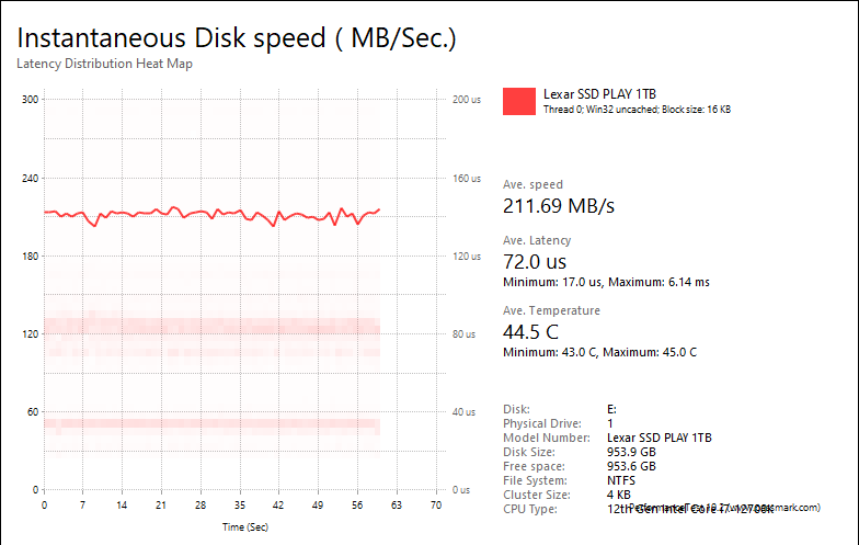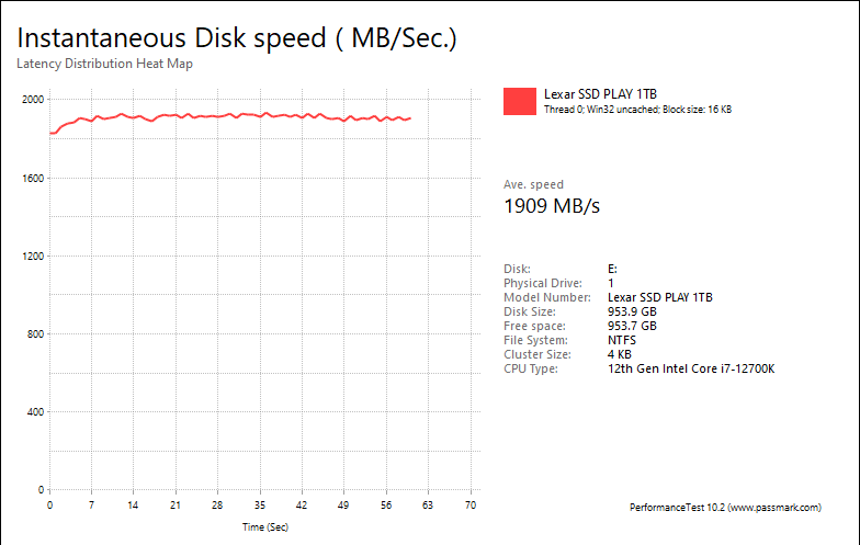 Overall, this PCIe 4.0 NVMe solid state drive's performance was acceptable. With results of 200.2MB/s, 1909MB/s, 1947MB/s, and 211.69MB/s, respectively, the PLAY 1TB was about as expected for a compact budget performance drive. For reference, the WD_BLACK SN770M 2TB was at 350.14MB/s, 2487MB/s, 2771MB/s, and 221.95MB/s, respectively, while the Crucial P5 Plus 2TB came in at 235.11MB/s, 1773MB/s, 1808MB/s, and 173.78MB/s. The best-on-record Lexar Professional NM800 PRO 2TB posted results of 444.92MB/s, 3259MB/s, 3453MB/s, and 282.82MB/s, in the same order.