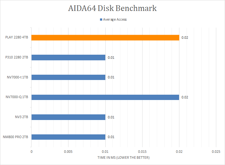 From the graphs above, the Lexar PLAY 2280 4TB performed below average. Across the four tests, it ranked near the bottom of the tested drives. In the linear test, it was, on average, the fifth placed SSD, which places it under even some QLC-based SSDs like the Netac NV7000-Q and Kingston NV3. The mediocre results continued with the random read and buffered read tests, ranking last and second to last in the results, respectively. These tests were also validated with several runs to ensure its accuracy. Finally, its access time was 0.02ms, which is tied for the highest latency, but this is not a huge deal.