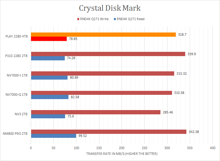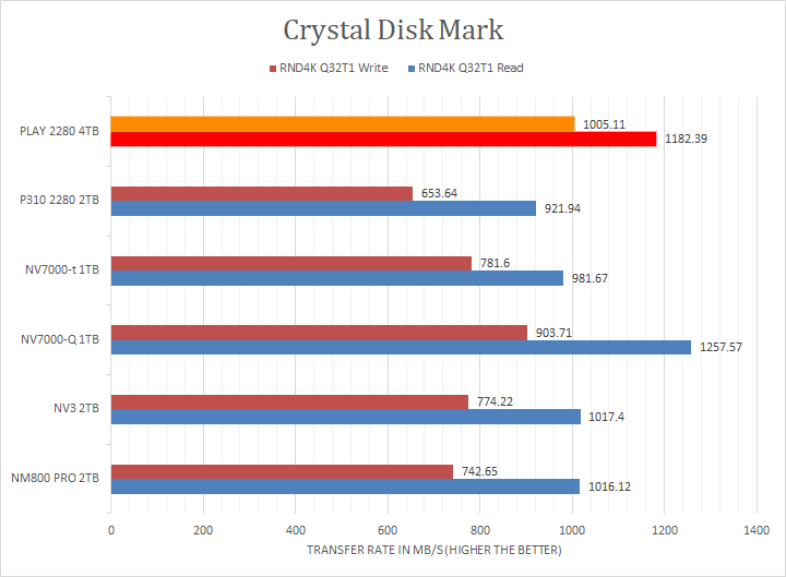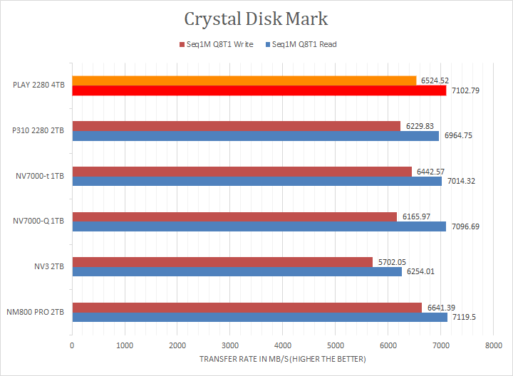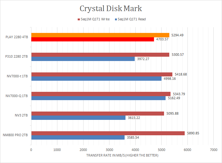 Lexar has made maximum claims of 6500MB/s write and 7400MB/s read for the PLAY 2280 4TB. We normally see these peaks through Crystal Disk Mark, and from our results, you can see our unit comes near these numbers. In the sequential 8-queue results, the Lexar PLAY 2280 4TB peaked at 6524.52MB/s write and 7102.79MB/s read. This was the second fastest in both writing reading for the six drives compared. The sequential single queue results were slightly below average, ranking in the fifth for writing but third for reading. In the random 4K, 32-queue test, its write and read performance were the fastest and second fastest. Moving to the random 4K, single queue test, the PLAY 2280 4TB provided the third fastest write and fourth fastest read. You can make other comparisons from the graphs above.