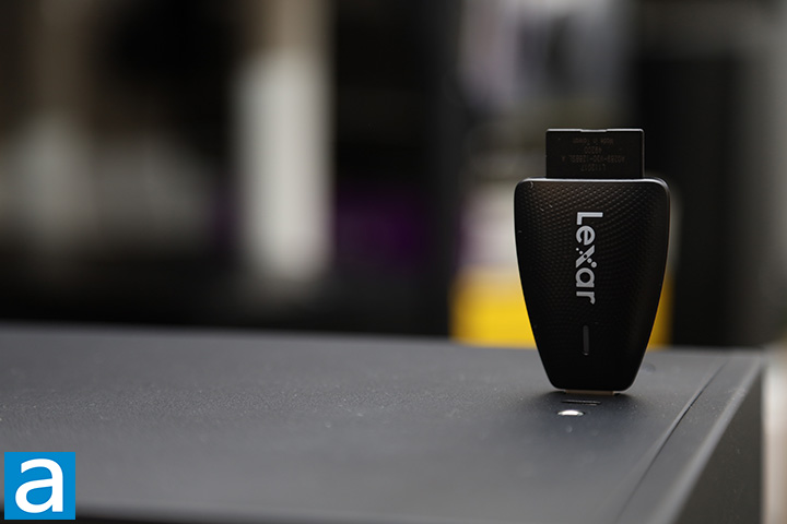 For our testing, Lexar also threw in the Multi-Card 2-in-1 USB 3.1 Reader. Reviewing flash memory cards are tricky because the performance of the card depends on the reader, This means you want the fastest reader available to ensure the card's performance is not limited by the reader. This portable, rather than desktop-style readers like the Kingston FCR-HS4, measures in at 38.2mm wide, 63.9mm deep, and 15.3mm tall. This plastic adapter can be a decent travel companion, especially if you have a laptop that does not have a built-in SD card reader, but it is not the type you will leave plugged in perpetually. The reader's predominantly plastic construction feels light and plasticky -- for a lack of better term -- but it is what it is. The black textured plastic gives it a little more visual flare with Lexar's logo in white as well as an indicator LED. The LED glows red when there is no card inserted and turns to blue when you plug in a card. The indicator LED will blink when there is activity. The back features a plain matte finish with regulatory logos printed on it.
