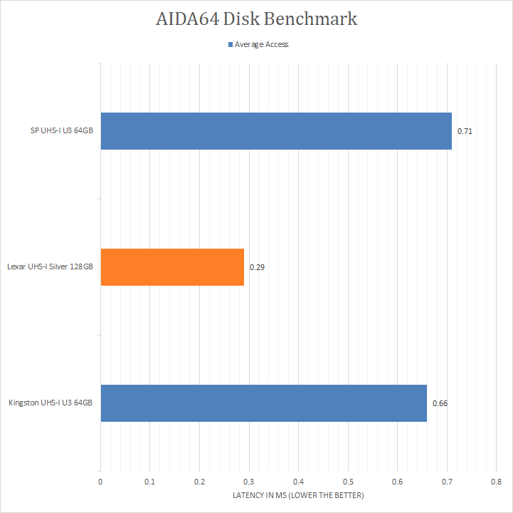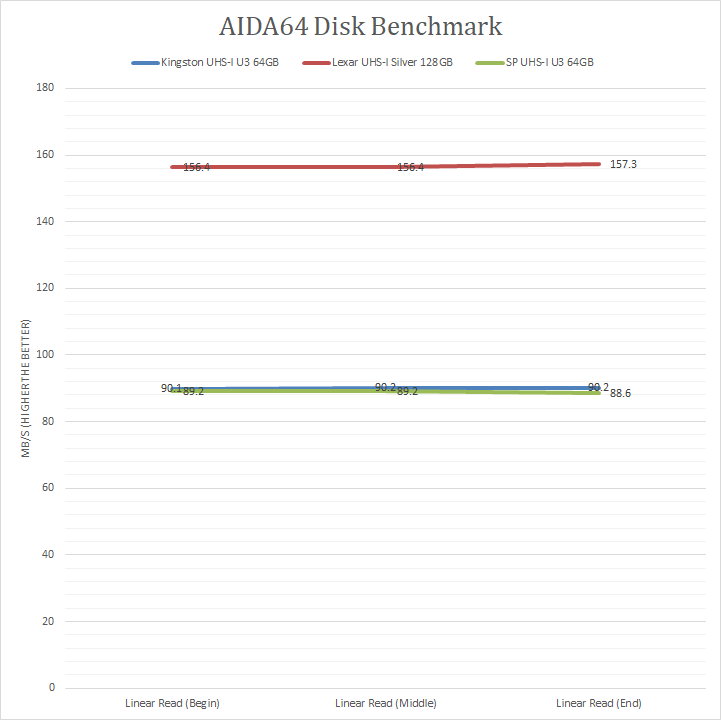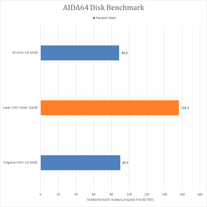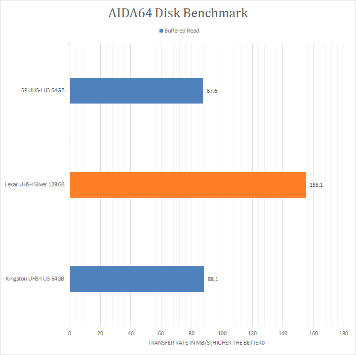 Since our flash memory review benchmark results are presented in alphabetical order, first up on the list are results from one of our favorite benchmarking programs, AIDA64 Engineer. Version 6.32.5600, the latest release at press time, can be downloaded from our Downloads page. Just to note, AIDA64 Engineer is a full synthetic benchmark. Unlike full synthetic motor oil, this usually does not always carry a good connotation. It does provide valuable insight into performance between different tested devices though. As you can see in our graphs above, the Lexar Professional 1066x SDXC UHS-I Silver 128GB absolutely dominated all other tested UHS-I SDXC cards. It scored consistently around the 156MB/s mark in the linear read segment. The tested latency was relatively low with an average of 0.29ms. The rest of the comparison results against all the other cards can be seen in our graphs above.