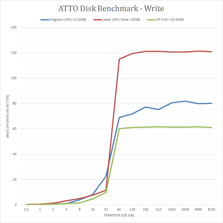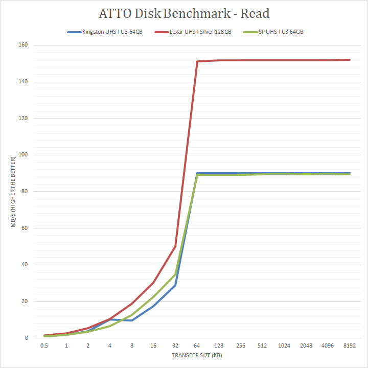 Following up next are our usual ATTO read and write tests. ATTO is an often-quoted benchmark because it is easy to use and accurate. For the most part, it is a favorite among reviewers and I have grown to embrace it as much as the next for the last little while. ATTO uses easily compressible data. As manufacturer peak read and write performance ratings are usually achievable using ATTO, whether a device lives up to its marketing claims or not can be validated by this program. Lexar claims the Professional 1066x SDXC UHS-I Silver 128GB's maximum read and maximum write are pinned at 160MB/s and 120MB/s, respectively. The tested results were close to the advertised figures. It peaked at 152.08MB/s read and 121.62MB/s write. Under the curve, its write speed was consistently faster than both the Kingston SDXC UHS-I U3 64GB and Silicon Power Superior SDXC UHS-I U3 64GB. The read section shared a similar story. Overall, the Lexar Professional 1066x SDXC UHS-I Silver 128GB's performance was excellent compared to other UHS-I cards.