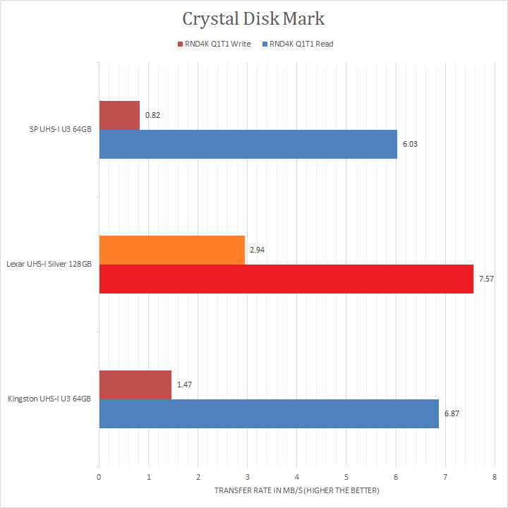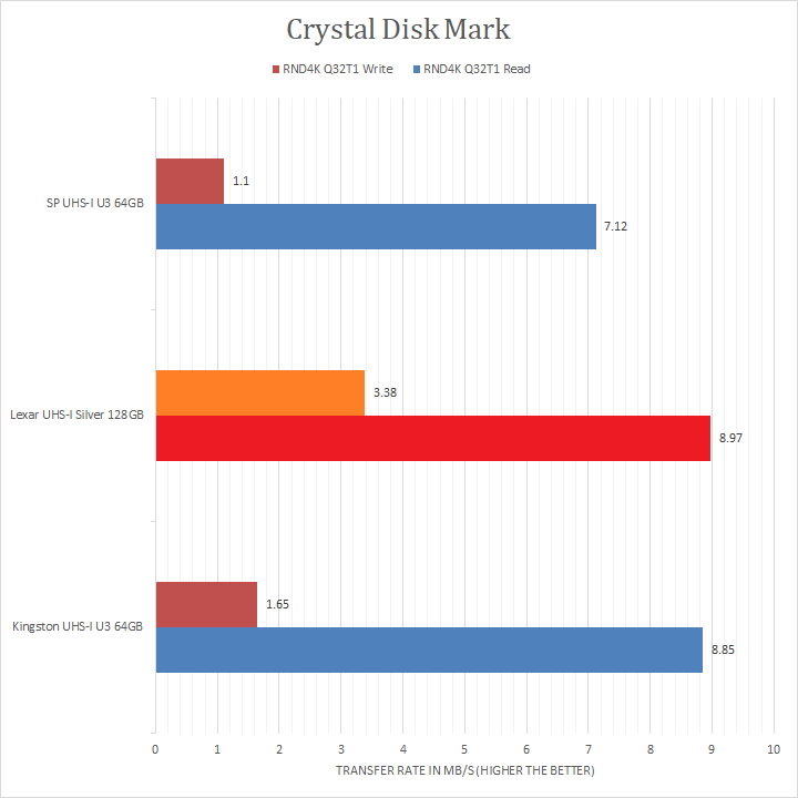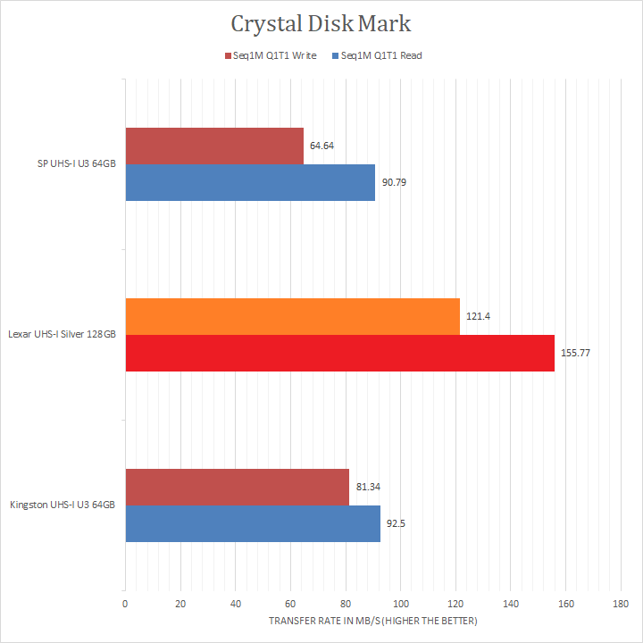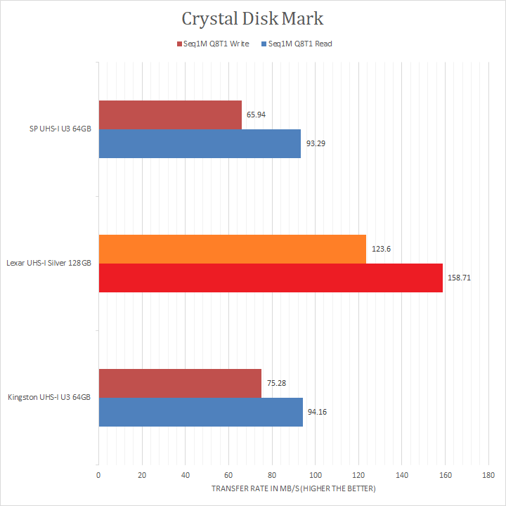 Crystal Disk Mark 8.0 is in the spotlight. Just a bit of background information, higher capacity devices tend to perform a little better in these tests. The ability of a controller and flash memory to deliver high IOPS will provide huge benefits to the score as well. Looking at the read and write results of all four sections, the Lexar Professional 1066x SDXC UHS-I Silver 128GB dominated the linear read and write section against the compared UHS-I SDXC cards and matched the advertised figures. It also dominated the Seq1M Q1T1 read and write test. Other SDXC cards got closer in the RND4K Q32T1 and RND4K Q1T1 segments, but was unable to exceed the Lexar Professional card at any point. I will let you make your own comparisons in our list of SDXC cards in the graphs above.