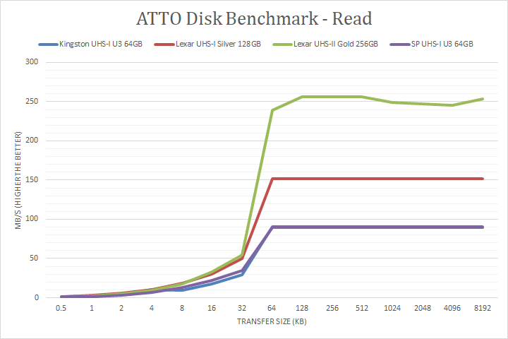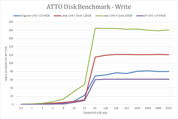 Following up next are our usual ATTO read and write tests. ATTO is an often-quoted benchmark because it is easy to use and accurate. For the most part, it is a favorite among reviewers and I have grown to embrace it as much as the next for the last little while. ATTO uses easily compressible data. As manufacturer peak read and write performance ratings are usually achievable using ATTO, whether a device lives up to its marketing claims or not can be validated by this program. Lexar claims the Professional 1800x SDXC UHS-II Gold 256GB's maximum read and maximum write are pinned at 270MB/s and 180MB/s, respectively. The tested results were close to the advertised figures. It peaked at 256.34MB/s read and 185.4MB/s write. Under the curve, its write speed was consistently faster than all the other tested cards. It was marginally slower than the Lexar Professional 1066x SDXC UHS-I Silver 128GB in the read section up to 32K, but the difference was very minimal. Overall, the Lexar Professional 1800x SDXC UHS-II Gold 256GB's performance was excellent compared to other SDXC cards.