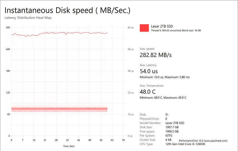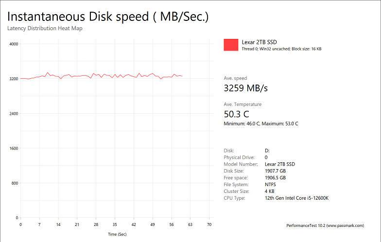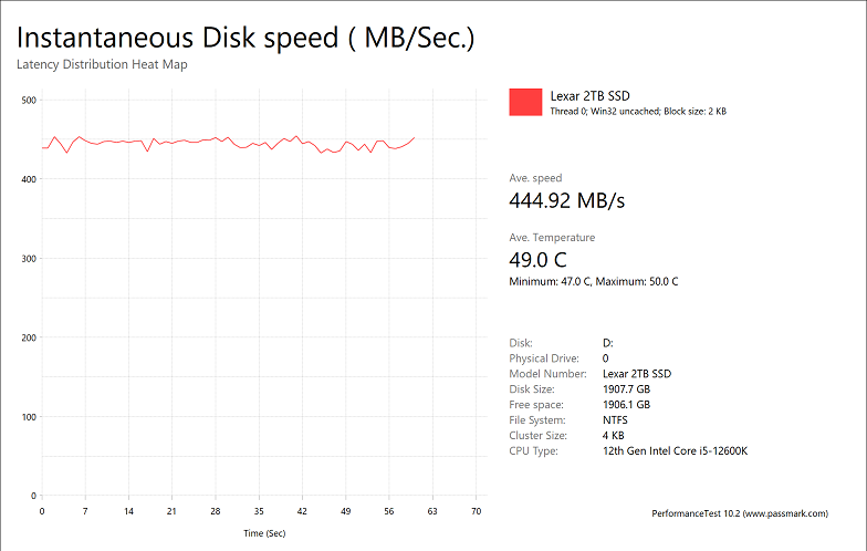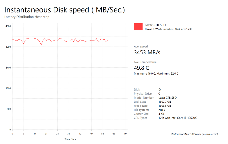 The Lexar Professional NM800 PRO 2TB provided very good results, with average speeds of 444.92MB/s, 3259MB/s, 3453MB/s, and 282.82MB/s, respectively. This is some of our fastest results we have seen. In fact, our previous leader, the WD_BLACK SN770 1TB, had numbers of 366.45MB/s, 2716MB/s, 2915MB/s, and 300.29MB/s, and was slower than the NM800 PRO 2TB in all but one test. Other recent drives include the ADATA Legend 960 1TB with numbers of 256.58MB/s, 2023MB/s, 2093MB/s, and 298.14MB/s, and the Kingston FURY Renegade 1TB with results of 341.12MB/s, 2557MB/s, 2698MB/s, and 284.35MB/s, in the same order. Otherwise, it is great to see all of the graphs for the NM800 PRO 2TB were relatively flat, indicating consistent performance throughout.