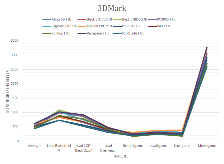 3DMark is the continuously updated version of the popular gaming benchmark from UL. We used 3DMark's Storage Benchmark to test the performance of the Lexar Professional NM800 PRO 2TB. According to UL, the Storage Benchmark uses traces recorded from popular games and gaming-related activities to measure real-world gaming performance. The following traces were used and defined as follows: