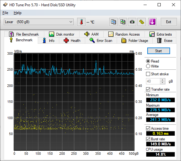 Unfortunately, HD Tune does not generate any fancy independent graph outputs in particular, so I just took a screenshot of the program. The Lexar Professional SL100 Pro 500GB remained very flat on average. It differed slightly in magnitude than HD Tach -- probably due to testing algorithms used -- but its performance characteristics were identical in practice. Other than that, the results were top tier across the range; the recorded access time was very low as we would expect from an external solid state drive. The SL100 Pro 500GB posted an average of 241.3MB/s for its sequential read speed, which is, again, quite a bit slower than the Crucial X8 1TB at 327.5MB/s and LaCie Rugged SSD 1TB at 367.3MB/s. The Lexar Professional SL100 Pro 500GB's tested latency was slightly different compared to AIDA64 and HD Tach at 0.163 ms. Do keep in mind the discussion we had on the previous page, as it still applies here.