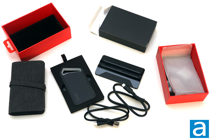 Out of the box, the Lexar SL660 BLAZE 1TB actually comes with quite a few accessories. The front sleeve can slide off to reveal a fully red box, which then can further be opened to show the portable SSD sitting in a foam-lined bracket. Underneath, Lexar also includes the aforementioned hard plastic stand as well as two cables. One is a USB Type-C to Type-C cable, while the other is a USB Type-C to Type-A. They both measure around 43cm in length. One nice addition is the inclusion of a felt-lined carrying case to hold all of the accessories together. Otherwise, we also have a small quick start guide and warranty page. Just to note, the Lexar SL660 BLAZE 1TB is covered for 5 years, which is a decently long time.