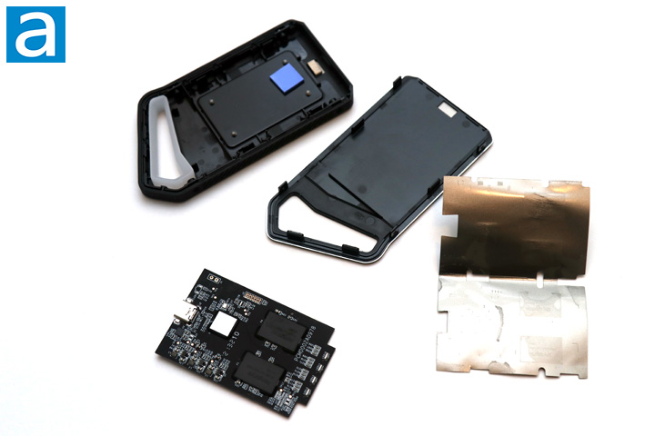 Taking apart the Lexar SL660 BLAZE 1TB is not exactly easy, although most users should not need to pop this external storage open. I started by removing the four screws around the edges, then used some pry tools and guitar picks to slide it open. After a few clicks, I was able to pull one side metal piece away from the other one. Inside, the main PCB can be found saddled between two pairs of plastic clips. It is also wrapped in a thin metallic sleeve that acts as a heatsink across all of the components. From here, you can also see a square block of a blue thermal pad that makes contact right over the controller of the drive. This diffuses the heat into the rest of the aluminum enclosure. After removing the outer shield, you can see on this side we have two NAND flash chips and the drive controller. At one end is the USB Type-C connection, while the other edge holds four LED lights. This shines directly at the translucent plastic loop to make for some nice lighting effects.