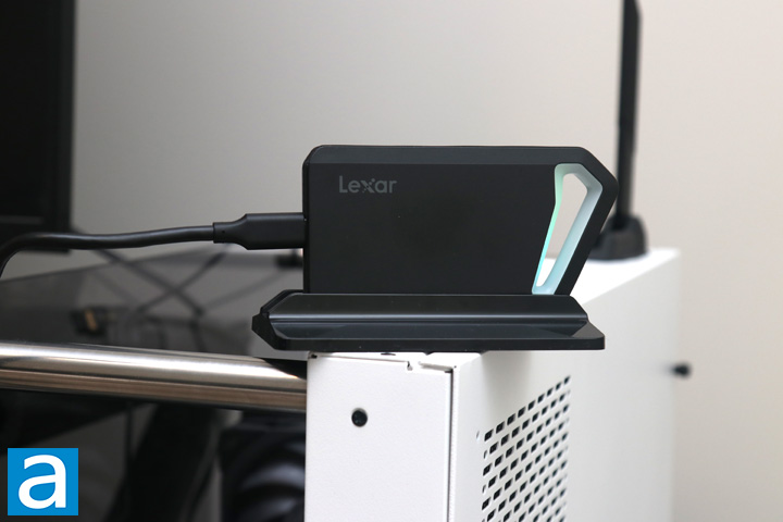 From here you can see the Lexar SL660 BLAZE 1TB is plugged in with the RGB LED lighting glowing. Unfortunately, there is no way to choose the lighting patterns or colors, as it cycles through a set of colors continuously. Other than implementing patterns, it might have been nice to see different colors based on drive activity. Otherwise, you can also see I have mounted this drive to its stand. The stand attaches with friction, holding to the edge of the SL660 BLAZE. It adds an additional 64g of weight and is sturdy enough to keep it upright. There are four rubber feet on the bottom to prevent it from sliding about.