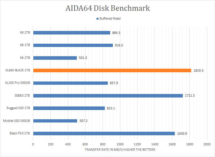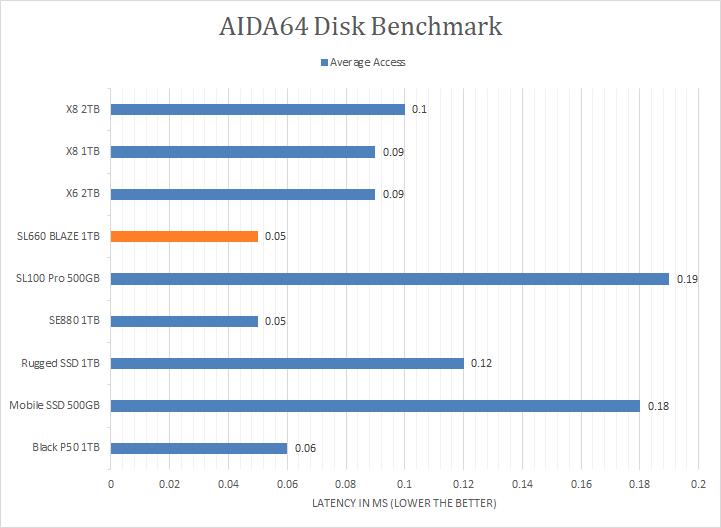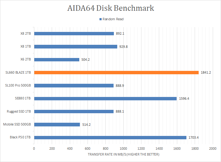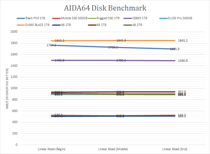 Alphabetically, the first benchmark is AIDA64 Engineer. Version 6.70.6000, the latest release at press time, can be downloaded from our Downloads page. This is a fully synthetic benchmark, which means it may not necessarily represent real-life performance. However, it still provides valuable insight as we can compare the performance between various drives and their controllers. From the four graphs above, you can see the Lexar SL660 BLAZE 1TB provided a dominant showing with the results. It scored notably higher than other USB 3.2 Gen 2x2 drives, including the Western Digital Black P50 and ADATA Elite SE880. In the linear read tests, the SL660 BLAZE maintained a consistent 1840MB/s here, with a notable delta over the other two primary competitors. The tested latency was also quite low with an average of 0.05ms. The other results also show favorable numbers for the SL660 BLAZE, which is great to see.