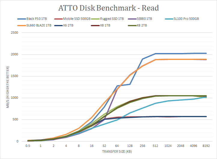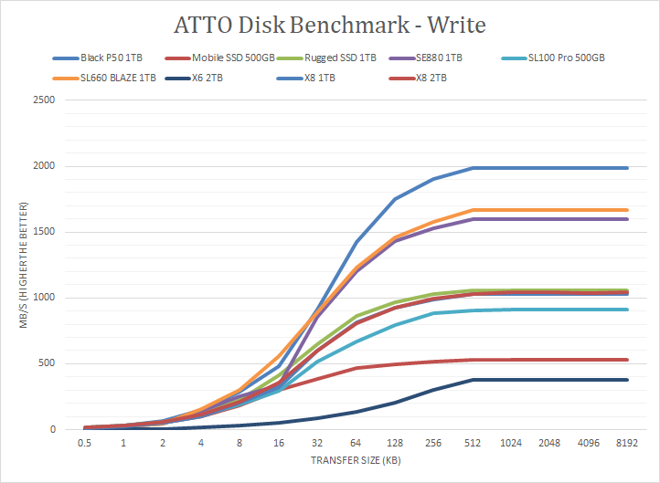 Up next is our usual ATTO read and write tests. ATTO has been one of our longest lasting benchmarks over the time mainly due to its accuracy and thorough testing in accordance to varying transfer sizes. ATTO uses easily compressible data, so compression-heavy controllers will perform very well here. For the Lexar SL660 BLAZE 1TB, the results are generally also quite good. This includes peak write speeds of 1670MB/s and read speeds of 1890MB/s. Under the curve with smaller transfer sizes, it was in the middle of the pack for the write curve, matching the ADATA Elite SE880 1TB. It also traded blows with the Western Digital Black P50 1TB in the medium packet sizes before reaching the peak. From 4K and larger packet sizes, the SL660 BLAZE was in first or second place compared to the rest. Under the read curves, the SL660 BLAZE continued its strong showing. Up to 32K packets, this drive was firmly in the lead with discernible deltas ahead of the two USB 3.2 Gen 2x2 Western Digital and ADATA options. From 64K onward, the SE880 1TB made up some ground and matched the SL660 BLAZE, while the P50 moved ahead to its peak speed. Once again, these are excellent results from this drive.