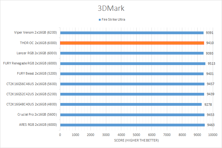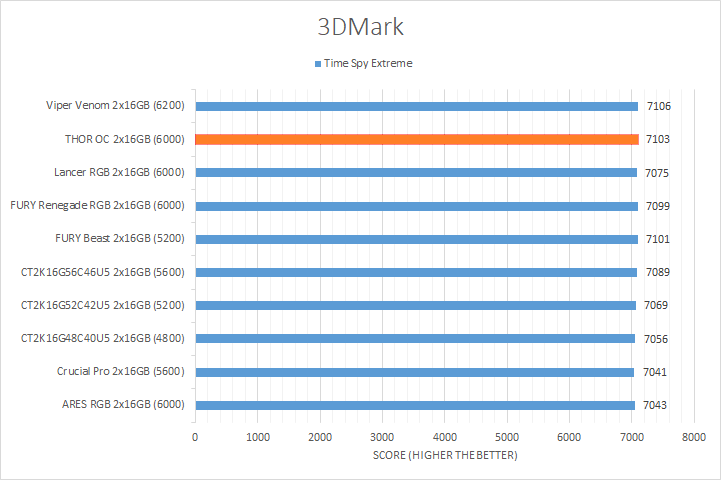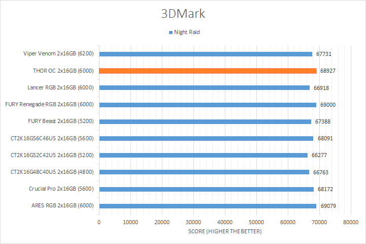 Similar to UL's PCMark 10, 3DMark is another favorite among enthusiasts and reviewers alike. In fact, it has been part of the APH Networks' battery of standard benchmarks since the very beginning. The latest iteration of 3DMark is available in a series of presets. We included Port Royal, Time Spy Extreme, Fire Strike Ultra, and Night Raid. Port Royal is for real-time ray tracing, Time Spy Extreme tests 4K gaming with DirectX 12, Fire Strike Ultra tests 4K gaming with DirectX 11, and Night Raid is a DirectX 12 test for PCs with integrated graphics. From the graphs above, you can see all our kits were close regardless of the memory bandwidth. The largest margin was found in the Night Raid test with a 4% difference from the highest to lowest. Even so, this was not too surprising, as these tests were more dependent on the GPU used in testing and this was reflected by the smaller variations in the results. The Lexar THOR OC remained competitive in its results, keeping up with the other DDR5-6000 kits.