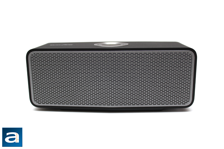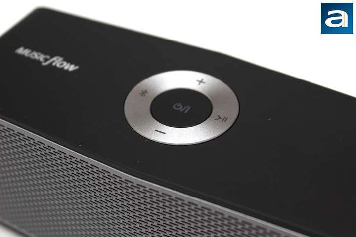 As for buttons and user input, all the controls for the LG Music Flow P5 are located on the top of the Bluetooth speaker in the middle. The large center button is used to power on and off the device. The top and bottom buttons around the circle are volume up and down buttons, respectively. To the left, we have a Bluetooth button, and holding it down allows the Music Flow P5 to be used to pair devices. As you may have read, this speaker actually can be paired to two devices simultaneously, with playback swapping between the two easily. I would have liked to see NFC tapping to pair as a feature here, just to make the syncing process simpler. Finally, the right button is used for playing and pausing music. Double tapping it proceeds to the next song, while triple tapping it goes to the previous track. Finally, the center, left, and right buttons are illuminated with an LED, depending on the mode you are in. If you are connected to the speaker with Bluetooth, the left button glows, while if you are connected with a 3.5mm audio jack, the right button glows. The center button shines only when powering on and off the device.