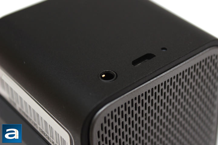 On the right side of the speaker, there are three more points of interest. On the left most side is a 3.5mm audio jack opening, and this allows you to directly plug in audio sources, such as laptops, mobile device, or even MP3 players, if you still have those. It would have been nice to see a short audio cable coming with the LG Music Flow P5, especially as not as many people may have this cable lying around. Next, we have a micro USB port, which is used solely for charging the Music Flow P5. Inside there is a 2100mAh battery, which is the same capacity as the Inateck BTSP-10 Plus. However, LG claims this speaker will last up to fifteen hours, while taking three hours to fully charge. We will see how these claims stand up when I look at the performance later in the review. Finally, you might think the last small hole is possible a reset button, but this is actually an LED light used to indicate when the speaker's charging status. It glows red while charging and green when it is finished.