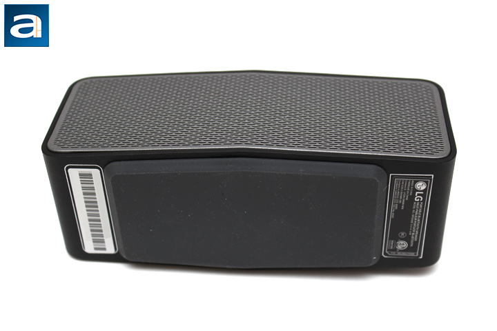 Finally, we get to the bottom and the back of the LG Music Flow P5, and as I have said before, the back mimics the front's appearance in terms of the grille. This being said, sound is only output at the front of the device. Otherwise, at the bottom, you can see several LG stickers and serial number information. In the middle is a large rubber pad to provide some stability for the speaker. As sound often creates vibration, this pad will reduce any sort of vibration caused between the speaker and the surface it sits upon. It also provides a very good grip, as the speaker should not slide around while it is in use.