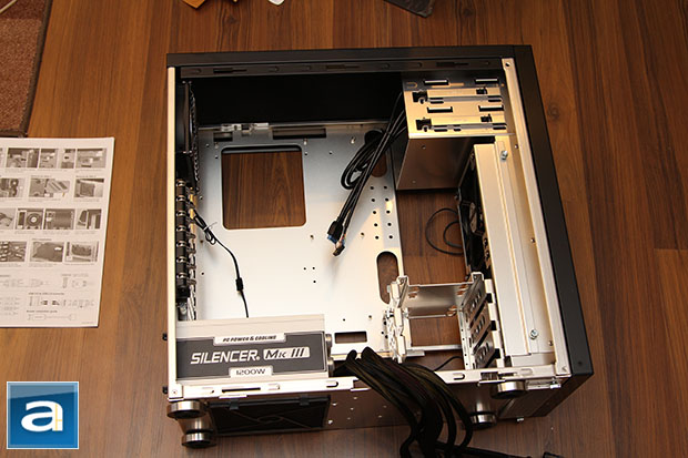 The installation process is extremely straightforward with the Lian Li PC-B12. For the most part, it is very easy to work with as far as a standard mid-tower is concerned. Out of preference, I installed the power supply first, followed by my ASUS P8P67 WS Revolution motherboard. The power supply used was a PC Power & Cooling Silencer Mk III 1200W reviewed by Yours Truly last week. It appears to me the PSU intake vent's location is not perfectly aligned, especially if you have a smaller PSU -- larger units like the PCP&C I have used is not a big issue. Either way, this is nothing to get overly worried about, because the additional 1 cm raise the PC-B12 provides is sufficient enough for allowing airflow into the power supply anyway. As I have talked about earlier in this review, the opening on the motherboard tray to accommodate aftermarket heatsinks with their own backplates is not large enough, or at least not in the correct location. It should have no problems working with older motherboards; unfortunately the average Intel CPU socket location has shifted since late 2009. For a chassis released in late 2012, I think Lian Li should have addressed this problem already.