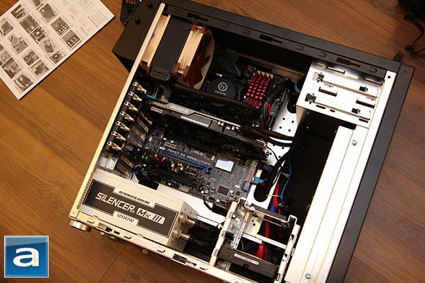 The rest of the installation process came and went just as smoothly, as I continued to install the rest of my components. You can even install your motherboard with thumbscrews, but for an extra touch of security, I kept my screwdriver handy. The only exception to this otherwise smooth process rolled around when I pulled the EPS 8-pin cable from my PC Power & Cooling Silencer Mk III 1200W to its intended location from behind the motherboard. The top opening on the tray corresponding to this connector is simply too small for such an obtuse input angle; the solution is simply to tilt the upper panel up. Fortunately, with the removal of only a two screws, enough tilt can be applied, and everything is quite straightforward from this point on.