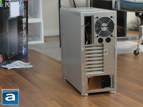 Remaining true in color to match the rest of the chassis, the back of our silver Lian Li PC-Z60 makes no effort to hide its aluminum nature -- definitely one of those things where you can be proud of the cash you have coughed up for classic Lian Li quality and craftsmanship. The layout is pretty much standard for a case with a bottom mounted power supply bay. We can expectantly spot an included black colored 120mm fan placed adjacent to the motherboard I/O backplate, with two pre-drilled water cooling holes next to each other right under. Your fingers are protected from the rear exhaust fan by a high quality, low air resistance fan grille. Obviously, it is cheaper to punch holes into the rear panel to save on production costs, but Lian Li's removable grille is a classic case of what to expect when you buy a high end chassis from the company. The expansion slot covers are fully ventilated as well, as shown in our photo above.