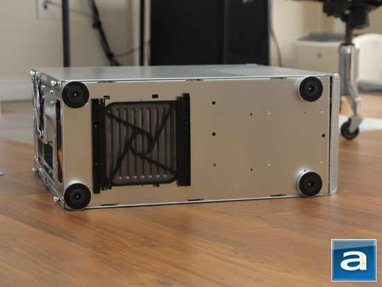 Large, shiny plastic legs with rubber bottom resembling those commonly found on home electronics can be seen on the Lian Li PC-Z60 as well. Combined with a 1.5 cm rise above the residing surface, like every other air intake, the company has a removable fan filter here to reduce dust from entering your power supply -- especially of those featuring a bottom mounted fan.
