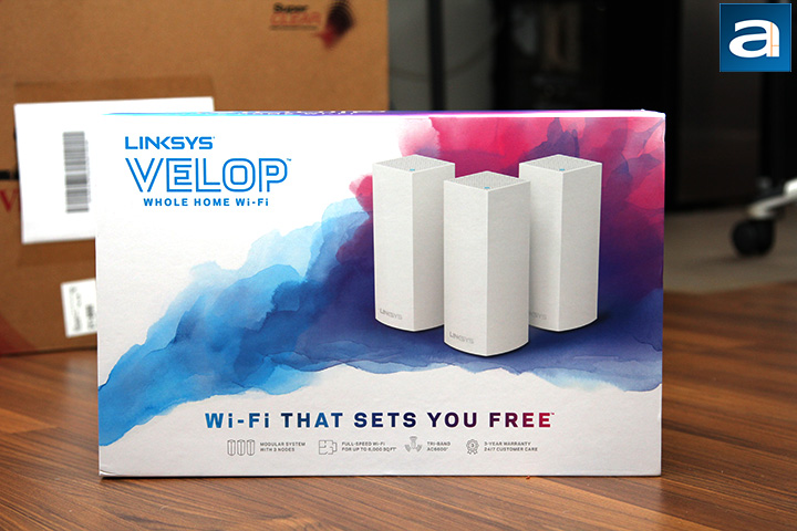 Upon opening the box, I was pleased to see a retail package of the Linksys Velop wireless system. The predominantly white, teal, and magenta color scheme is clean and modern in every way; appropriate for a product targeted towards home users. As you can see in our photo above, Linksys' logo and product name can be seen at the top left corner, with the text "whole home Wi-Fi" underneath to show what this is all about. In front of a watercolor background are three Linksys Velop nodes in three-quarters view. Across the bottom, you will find the slogan "Wi-Fi that sets you free" and four icons highlighting its modular system with three nodes, full-speed Wi-Fi for up to 6,000 square feet, tri-band AC6600, and three-year warranty. Diagrams, further feature highlights, and specifications can be found on the remaining sides of the box.