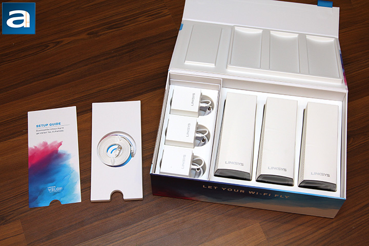 The retail box opens by a flap at the top. The first thing you will see is are three Linksys Velop nodes on a white plastic tray on the right. On the left is a quick start guide with a flat Ethernet cable on a tray underneath it. Removing the tray will reveal three power adapters with its cable neatly wrapped. I found everything to be very organized out of the box, and the product presentation was done a very classy manner.