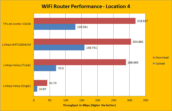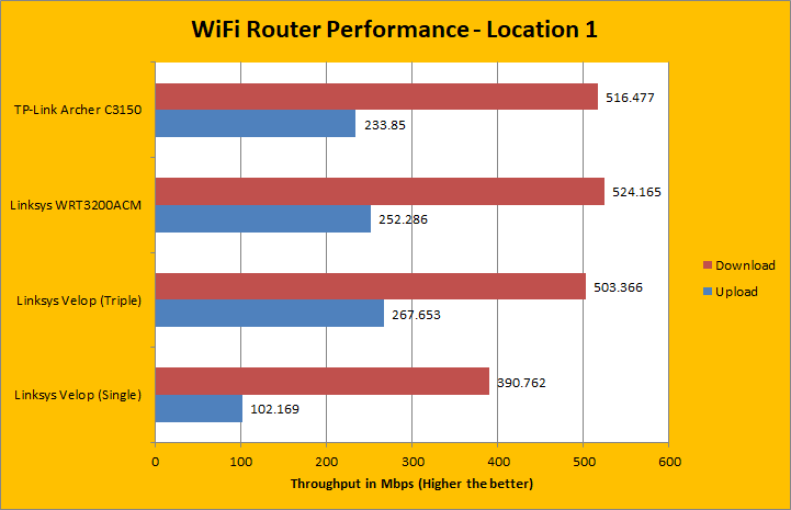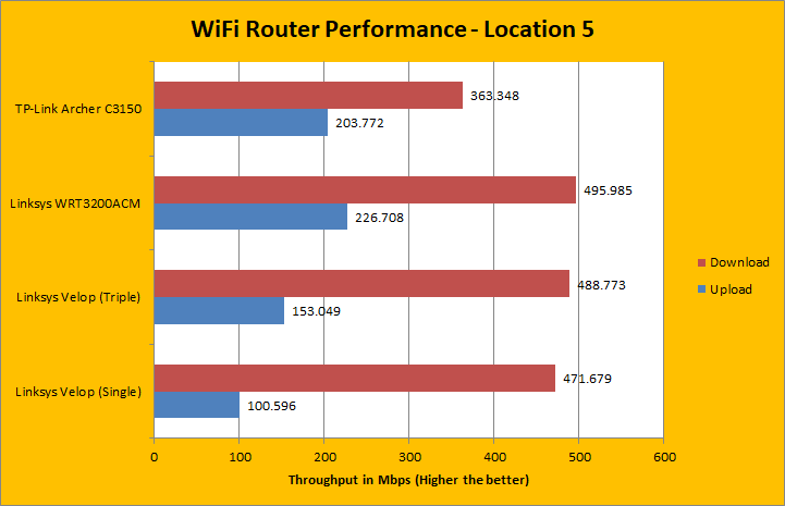 In Location 1, the Linksys Velop with a single node fell quite a bit behind the high-performance routers on the list. This should not come as much of a surprise, considering the Velop nodes are only rated at AC2200 compared to AC3150 for the Archer and AC3200 for the WRT3200ACM in this line-of-sight test. However, what was surprising was when I deployed two additional nodes, the mesh system suddenly matched the performance of its higher performance brethren. I have repeated all the tests multiple times and came out with the same results in the end. In Location 2, there was no appreciable difference between having one node and three nodes, likely due to the fact my computer was still connected to the same node. Although the Velop's download performance was comparable to the performance routers, the upload performance left quite a bit to be desired. The one node Velop had a lot of trouble reaching Location 3 due to power attenuation through a thick garage wall. An additional node placed just on the inside wall separating the house and the garage boosted performance considerably, but it still failed to outperform the WRT3200ACM. I could not place the additional node in the garage itself, because it was not able to communicate with the main node. The single Velop configuration also had a lot of trouble with Location 4 due to more distance and walls. Deploying an extra node one floor immediately below the primary node fixed the performance problems, but again, it was still slightly slower in download speed and only achieved half the upload speed compared to the WRT3200ACM. In Location 5, despite the laptop's close proximity with the newly deployed node, did not considerably outperform the single node Velop system due bottlenecks in the backhaul. Connecting directly to the central node one floor below was not much different than connecting to an additional node located one floor below with one hop.