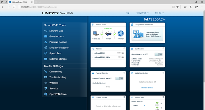 The above screenshot shows the main page of Linksys' WRT3200ACM after logging in. The predominantly blue interface is well organized with smooth transition animations. At the top, you will find a header bar with Linksys' logo, drop down menu to edit the router name, and a Sign Out button that drops down with an About page in addition to signing out. All the main functions are located on the left navigation menu. The principle area has eight widgets by default that shows crucial information and settings, including network status, wireless SSIDs, guest access information, parental controls, media prioritization settings, external storage configuration, and network devices.