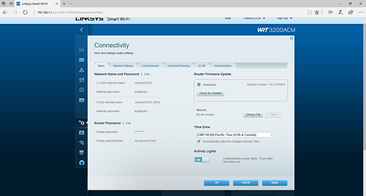 Up next is the Router Settings category. The first tab is Connectivity, as shown in our screenshot above. You can configure the router's SSIDs, encryption key, apply firmware updates, set the time zone, and enable/disable activity lights here. Subsequent tabs include Internet Settings, Local Network, Advanced Routing, VLAN, and Administration. The Local Networks sub-tab allows you to set router host name, IP, subnet, and DHCP options. Static routing, network address translation, and dynamic routing is located under Advanced Routing. In Administration, local management access interface and protocols can be set, along with the option to enable/disable UPnP and SIP for Application Layer Gateway.