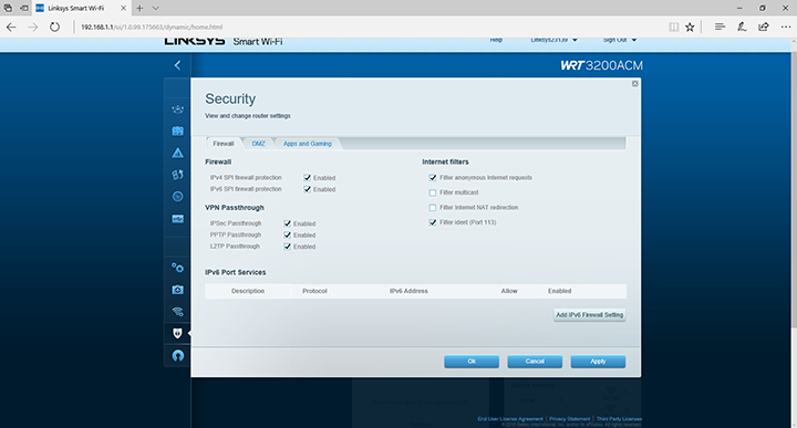The last screen I want to show is Security. In Firewall shown in our screenshot above, you can enable or disable SPI firewall protection, VPN passthrough, as well as internet filters. DMZ should be quite obvious, so I will not go through that. In Apps and Gaming, you can configure DDNS, single or port forwarding range, as well as port range triggering