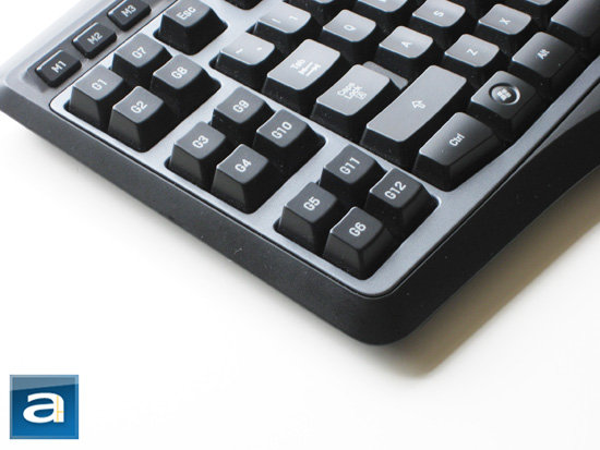 Like its predecessor, an array of G macro keys is placed on the left side of the keyboard. The original G15 had three sets of six for a total of eighteen keys. Now, that's quite a bit of programmable keys that clearly occupied too much room. The revised G15 had three sets of two for a total of six macro keys, but for most people that's not enough. With the Logitech G19, they've decided to take the middle ground for optimal space usage as well as a satisfactory amount of keys for three sets of four for a total of twelve G keys.