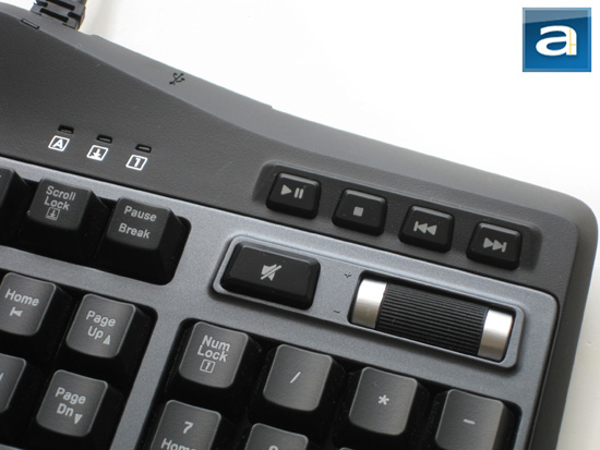 Before you faint out -- since I said hold your breath earlier -- let's cover the features on the top right corner of the Logitech G19. Above its standard number pad is a simple series of media controls, namely the Play/Pause, Stop, Skip Back, and Skip Forward buttons. The backlit color of these buttons can also be changed, just like the rest of the keyboard, albeit with a few minor exceptions. Sitting between the number pad and media control keys is a mute button, and a large volume control wheel. The volume control wheel is actually very smooth, exercises great grip on the user's fingers thanks to the rubber textured surface, and looks pretty cool, too.