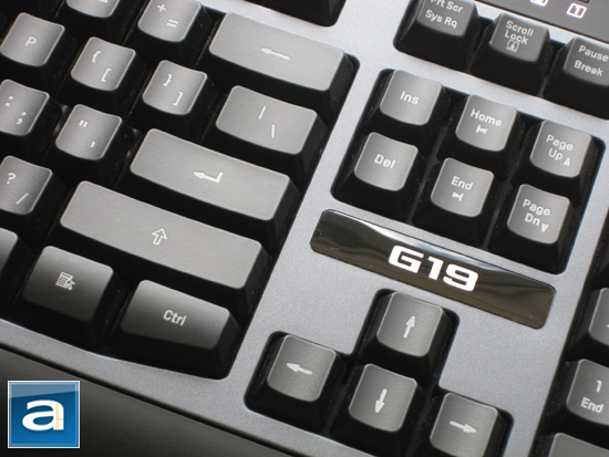 A bold, large, and shiny G19 logo situates between the arrow keys and productivity keys. The 'G19' text is also backlit, and its glow color can be set in uniform to the rest of the customizable backlit keys. Its reflective finish will make it a fingerprint magnet though, especially in that particular location. Either way, it is quite a nice touch in my opinion, not to mention that it doesn't use up additional room for where when implemented, as compared to the G15 -- a definite plus.