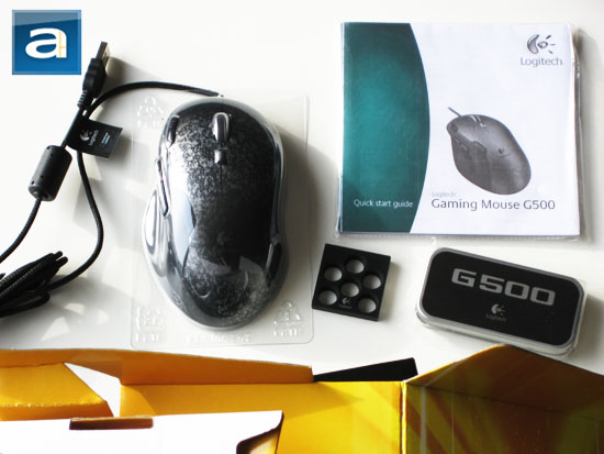A V-shaped partition resides inside the box to hold its contents in a neat and organized manner. Out of the box, you will receive the Logitech G500 mouse itself, an adjustable weight cartridge, tuning weights and case, CD with Logitech SetPoint software, and user guide.