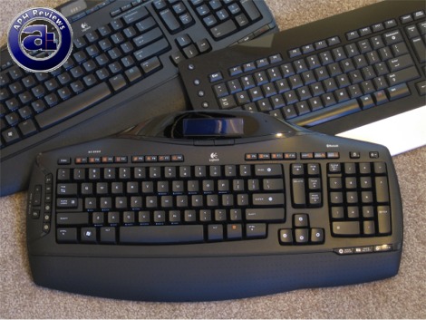 A relatively large LCD screen is at the top of the keyboard -- replacing the relatively tiny in comparison unit on the Logitech MX3200. The LCD matrix display has a low resolution; but regardless it can handle different font sizes as well as individual icons on the left side to indicate various things such as new mail message status, capslock, mute, and low battery indicator; in their respective order from the top.