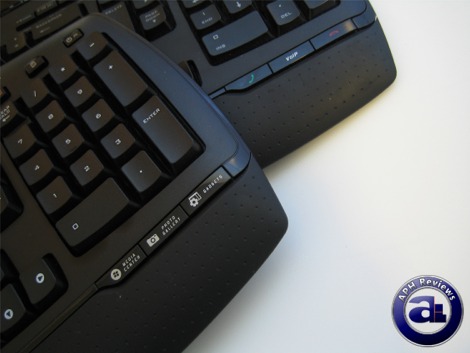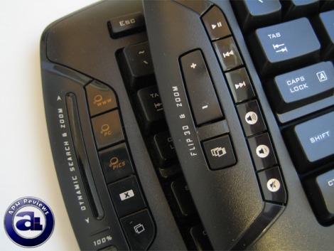 The media keys are moved from the LCD area perimeter to the left on the Logitech MX5500 keyboard. The six media controls replaces five miscellaneous buttons on the Logitech MX3200; while the touch strip and touch sensitive zoom reset button are replaced by a tactile zoom in/out button with a labeled Vista Flip3D hotkey right underneath. Besides that, the physical design and style of button placement in this area is very similar between the MX3200 and MX5500.
