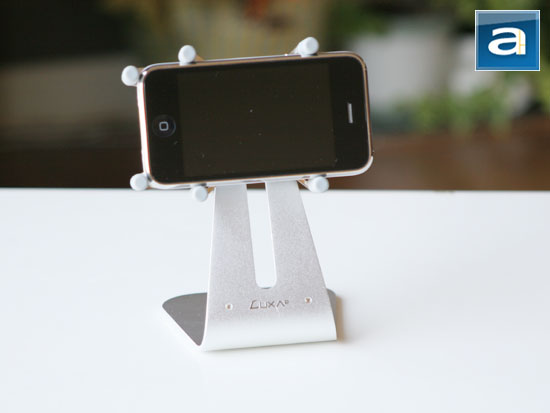 Under its center opening is LUXA2's shiny logo embossed onto the aluminum surface of the mobile device holder. Accompanying it on both sides are two Swarovski S285 crystals to enhance it looks (And make it sound cooler, like, "OMG yo my iPhone stand has Swarovski crystals!!"). They're small at 3.1mm, but tastefully integrated into the product to create a modern, elegant look.