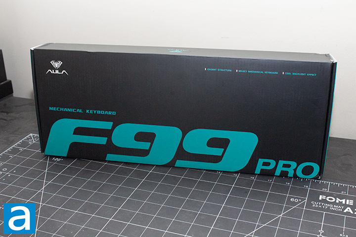 At first glance, the F99 Pro box evokes a familiar feeling. This is because the design utilizes the commonly used color palate of black, white, and shades of blue. It has a remarkably plain design with white and aqua-colored text on top of a black background. The keyboard name, "F99", is difficult to miss, as it is in the largest font sitting at the bottom of the box. To the right of it in smaller font, the "PRO" name distinguishes itself from the base version of the F99. The product description is printed above here. On the top right, the box states several features, including its gasket-mounted design, 99 keys, and a "cool backlight effect". The AULA logo is located on the top left, which nicely contrasts the simplicity of the box design with its sophisticated spider icon. The back of the box contains some technical specifications for the keyboard in eight different languages.